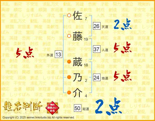 佐(7画)藤(19画) 蔵(18画)乃(2画)介(4画)