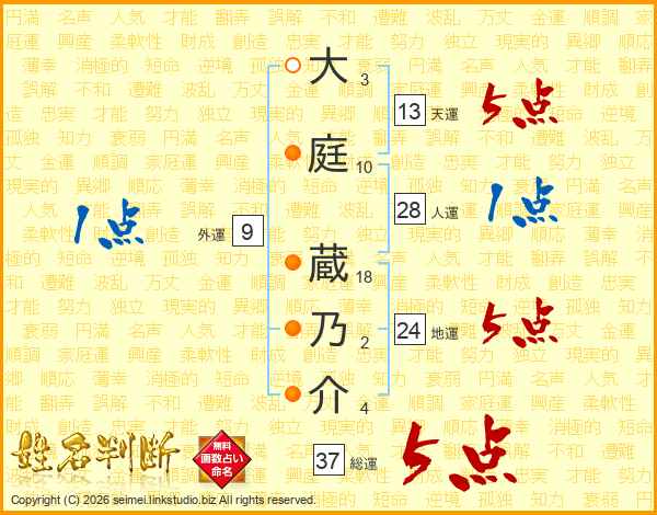 大庭蔵乃介さんの総運は37画の5点!