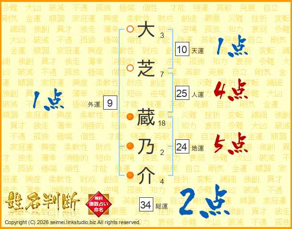 大(3画)芝(7画) 蔵(18画)乃(2画)介(4画)