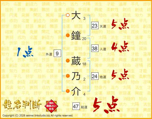 大(3画)鐘(20画) 蔵(18画)乃(2画)介(4画)