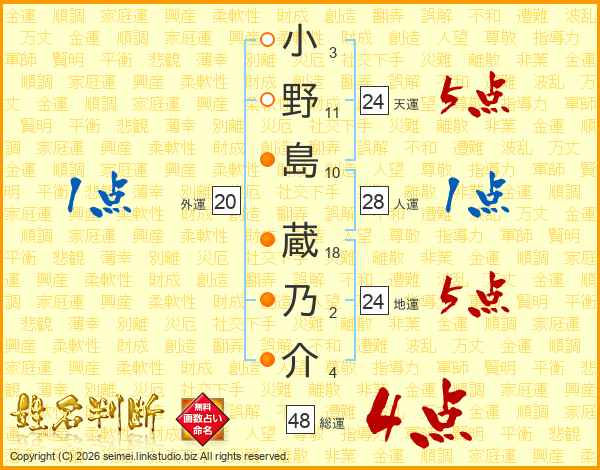 小(3画)野(11画)島(10画) 蔵(18画)乃(2画)介(4画)