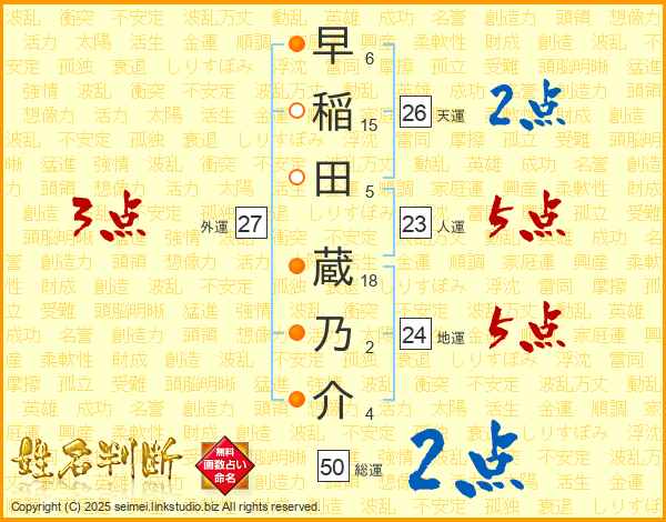 早(6画)稲(15画)田(5画) 蔵(18画)乃(2画)介(4画)