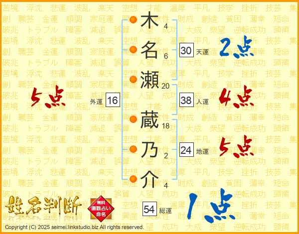 木(4画)名(6画)瀬(20画) 蔵(18画)乃(2画)介(4画)