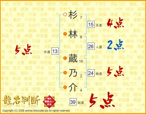 杉(7画)林(8画) 蔵(18画)乃(2画)介(4画)