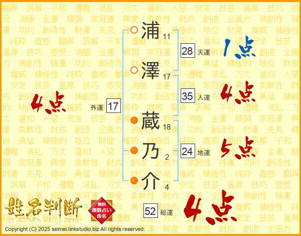 浦(11画)澤(17画) 蔵(18画)乃(2画)介(4画)