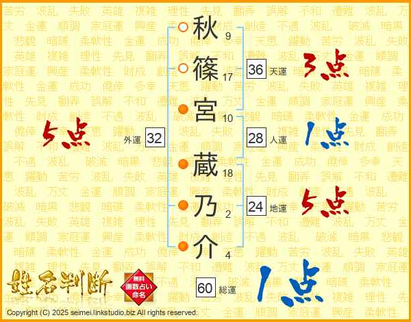 秋(9画)篠(17画)宮(10画) 蔵(18画)乃(2画)介(4画)
