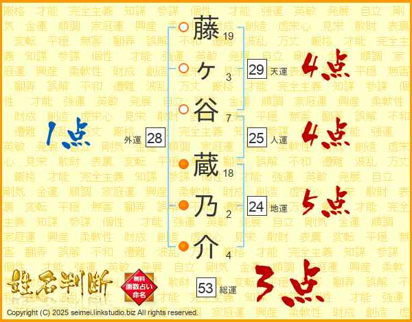 藤(19画)ヶ(3画)谷(7画) 蔵(18画)乃(2画)介(4画)