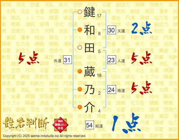 鍵(17画)和(8画)田(5画) 蔵(18画)乃(2画)介(4画)