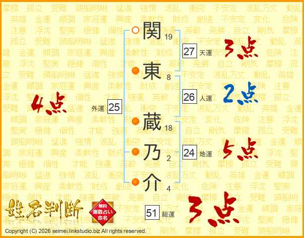 関(19画)東(8画) 蔵(18画)乃(2画)介(4画)