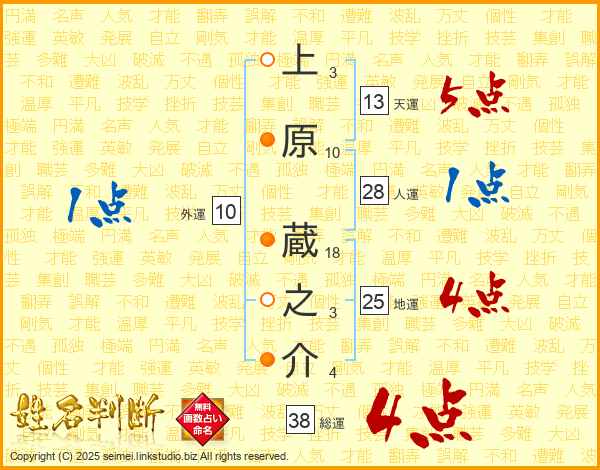 生活面を象徴する運勢です。外部から受ける影響力を表し、結婚運、家庭運や職場、環境への順応性を表します。総運から人運を引いた画数。姓や名が1文字の場合を除く。