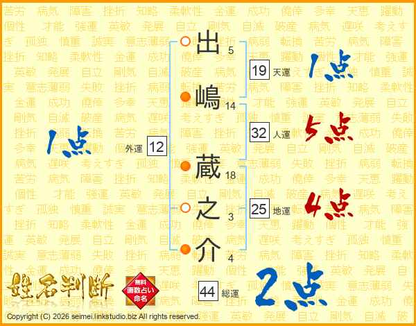 出(5画)嶋(14画) 蔵(18画)之(3画)介(4画)