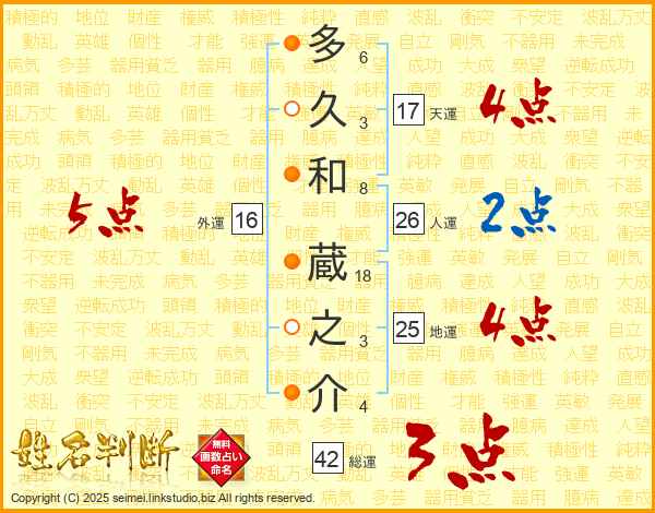 多(6画)久(3画)和(8画) 蔵(18画)之(3画)介(4画)