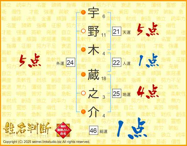 宇野木蔵之介さんの地運は25画の4点!