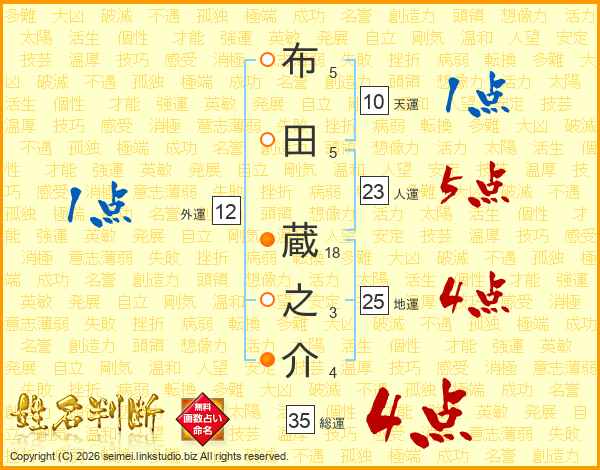 布(5画)田(5画) 蔵(18画)之(3画)介(4画)