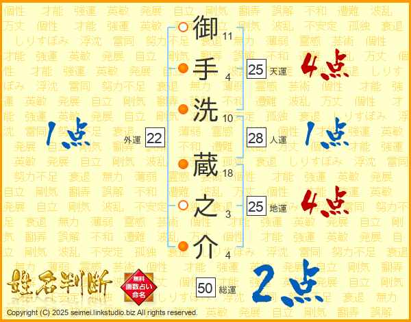 生活面を象徴する運勢です。外部から受ける影響力を表し、結婚運、家庭運や職場、環境への順応性を表します。総運から人運を引いた画数。姓や名が1文字の場合を除く。