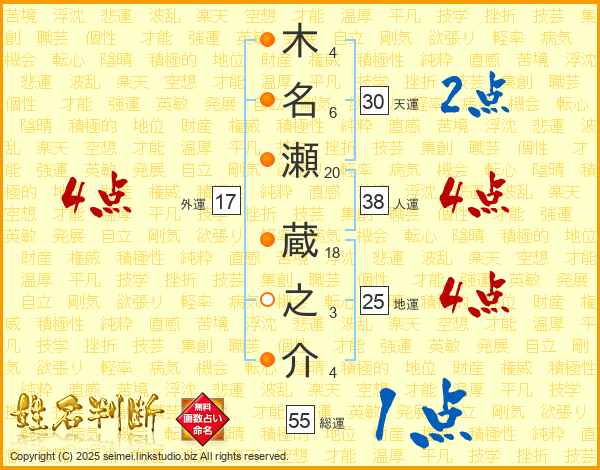 木(4画)名(6画)瀬(20画) 蔵(18画)之(3画)介(4画)