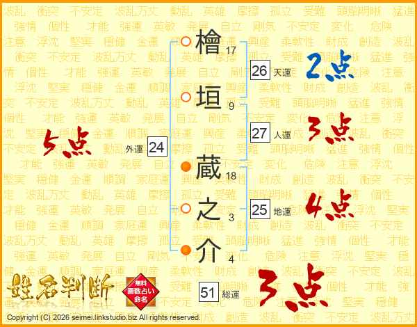 檜垣蔵之介さんの天運は26画の2点!