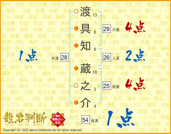 渡(13画)具(8画)知(8画) 蔵(18画)之(3画)介(4画)