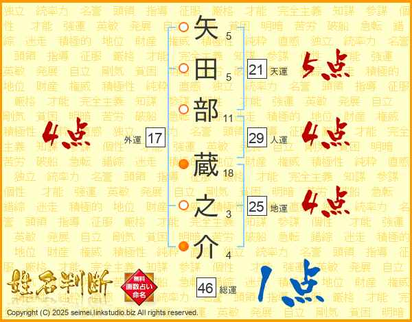 矢(5画)田(5画)部(11画) 蔵(18画)之(3画)介(4画)