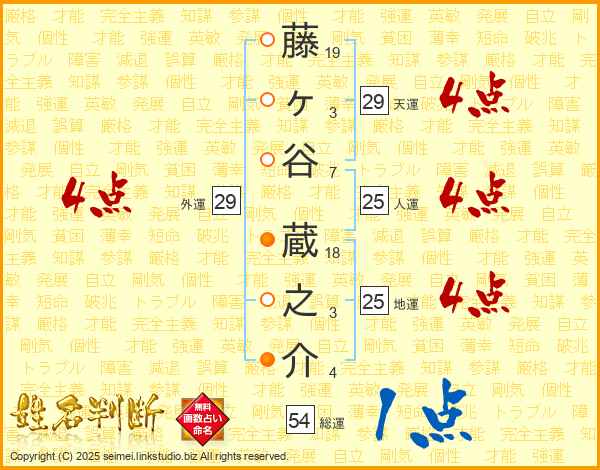 藤(19画)ヶ(3画)谷(7画) 蔵(18画)之(3画)介(4画)