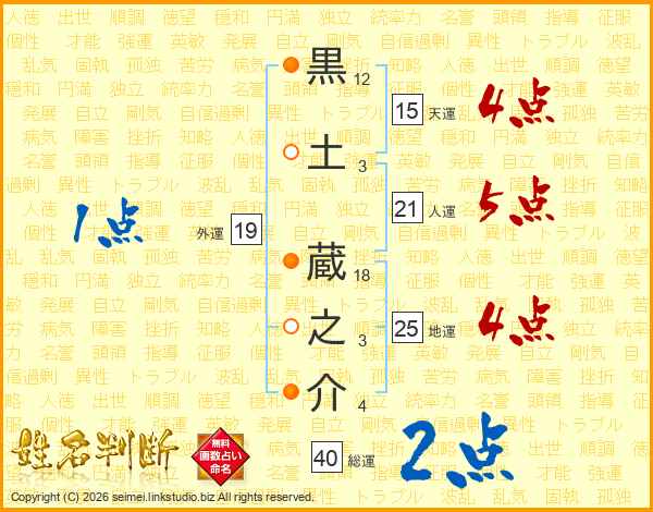 黒(12画)土(3画) 蔵(18画)之(3画)介(4画)