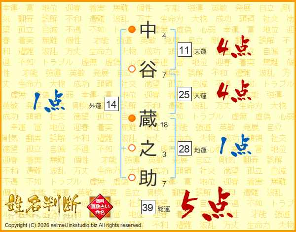 中(4画)谷(7画) 蔵(18画)之(3画)助(7画)