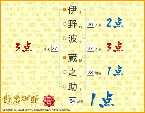 伊(6画)野(11画)波(9画) 蔵(18画)之(3画)助(7画)