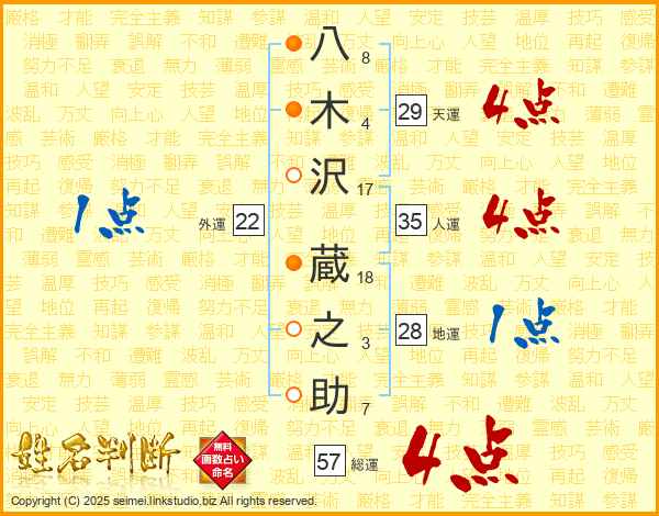 八(8画)木(4画)沢(17画) 蔵(18画)之(3画)助(7画)