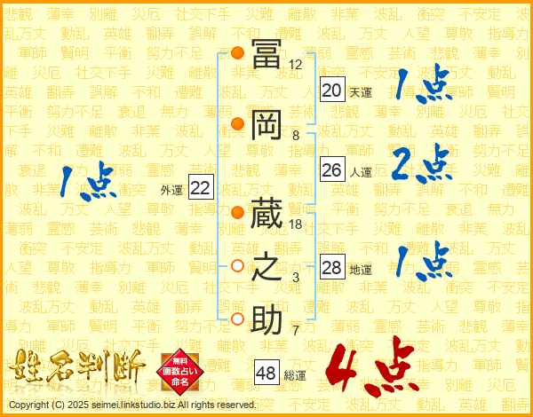 冨(12画)岡(8画) 蔵(18画)之(3画)助(7画)