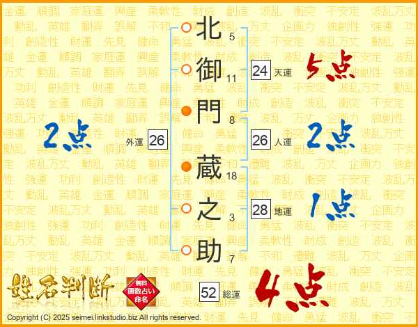 北(5画)御(11画)門(8画) 蔵(18画)之(3画)助(7画)