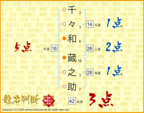 千(3画)々(3画)和(8画) 蔵(18画)之(3画)助(7画)