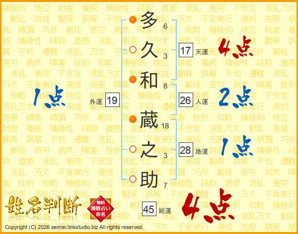 多(6画)久(3画)和(8画) 蔵(18画)之(3画)助(7画)