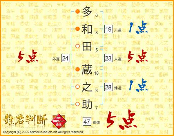 多(6画)和(8画)田(5画) 蔵(18画)之(3画)助(7画)