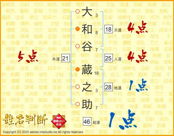 大(3画)和(8画)谷(7画) 蔵(18画)之(3画)助(7画)