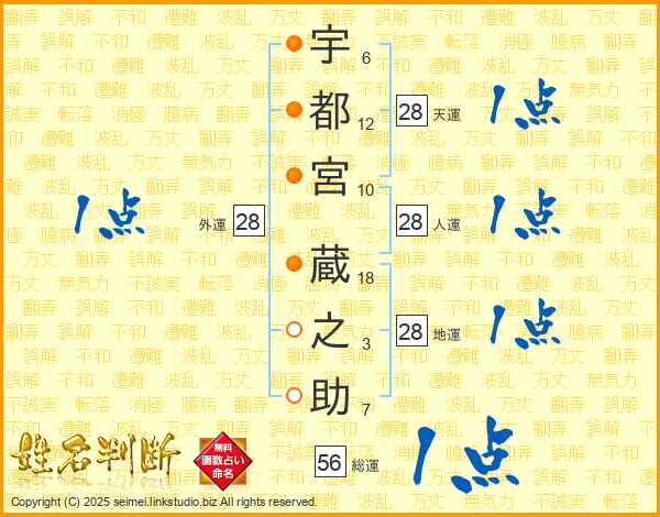 宇(6画)都(12画)宮(10画) 蔵(18画)之(3画)助(7画)