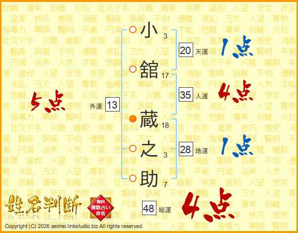 小(3画)舘(17画) 蔵(18画)之(3画)助(7画)