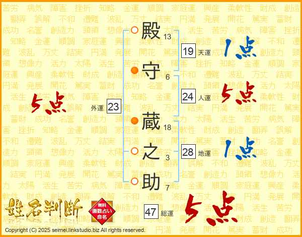 殿(13画)守(6画) 蔵(18画)之(3画)助(7画)
