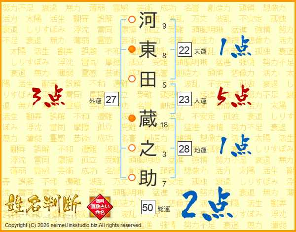 河(9画)東(8画)田(5画) 蔵(18画)之(3画)助(7画)