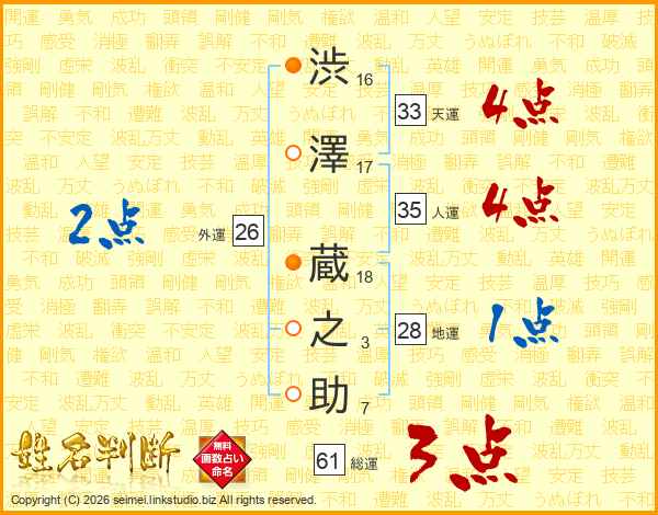 渋(16画)澤(17画) 蔵(18画)之(3画)助(7画)