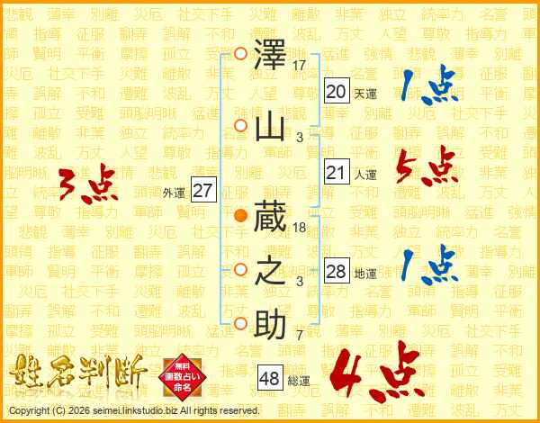 澤(17画)山(3画) 蔵(18画)之(3画)助(7画)
