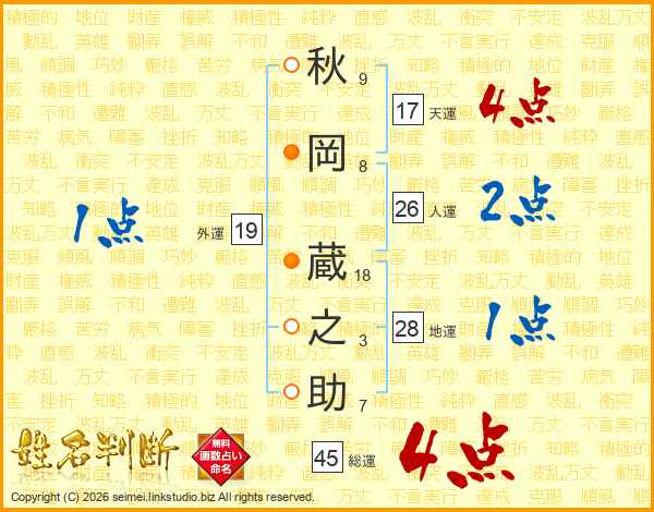 秋(9画)岡(8画) 蔵(18画)之(3画)助(7画)