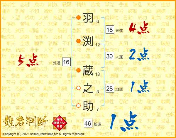 羽(6画)渕(12画) 蔵(18画)之(3画)助(7画)