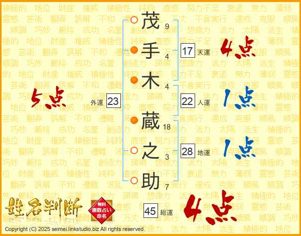茂(9画)手(4画)木(4画) 蔵(18画)之(3画)助(7画)