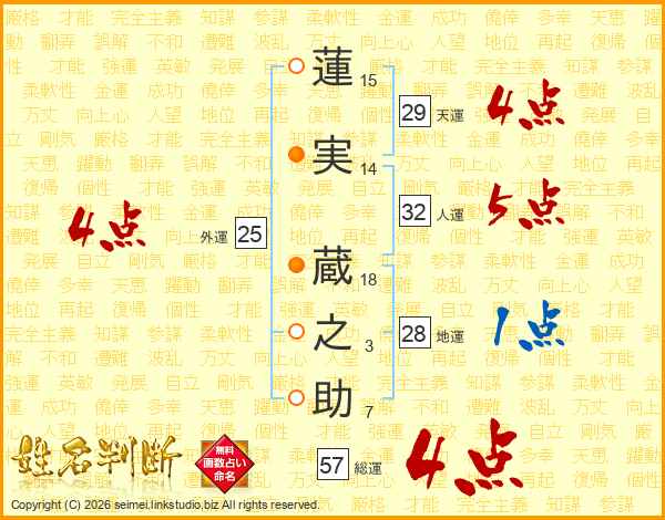 蓮(15画)実(14画) 蔵(18画)之(3画)助(7画)