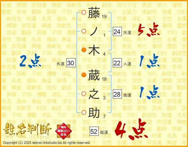 藤(19画)ノ(1画)木(4画) 蔵(18画)之(3画)助(7画)