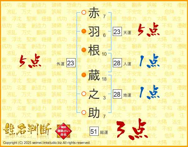 赤(7画)羽(6画)根(10画) 蔵(18画)之(3画)助(7画)