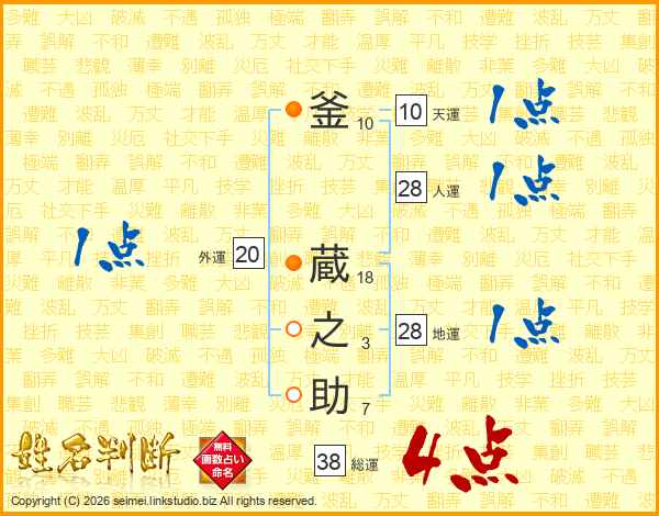 釜(10画) 蔵(18画)之(3画)助(7画)