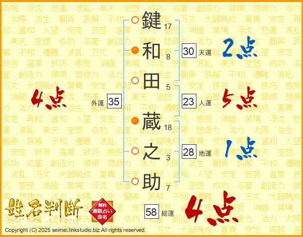 鍵(17画)和(8画)田(5画) 蔵(18画)之(3画)助(7画)