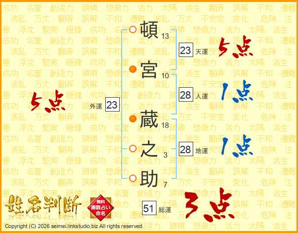 頓(13画)宮(10画) 蔵(18画)之(3画)助(7画)