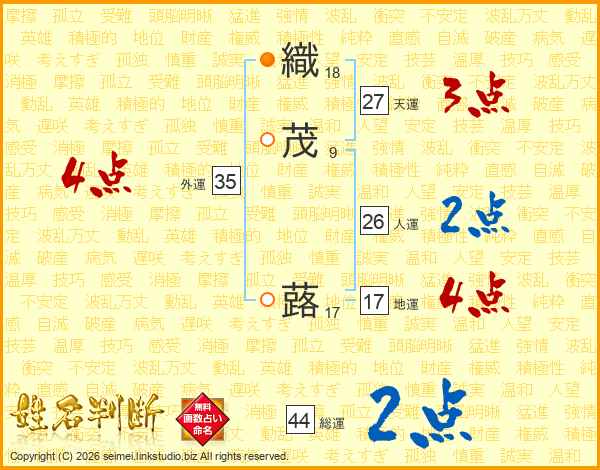 家系が持つ宿命的な運勢を表します。祖先から受け継いだ苗字ですので自分の力が及びません。家柄を象徴します。苗字の合計画数。